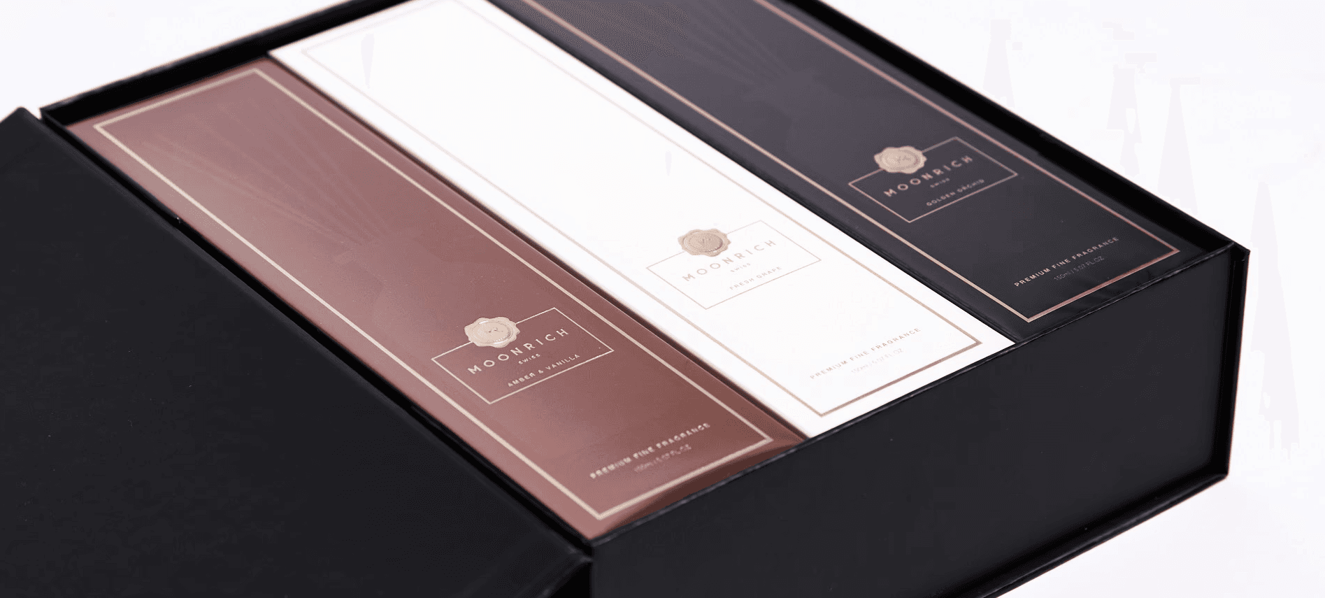 The packaging was developed to complement the bottle design and extend the Moonrich experience beyond the product itself. Materials, proportions, and finishes were carefully selected to communicate quality, elegance, and attention to detail. The packaging reinforces the idea of Moonrich as a luxury object, suitable for both personal use and gifting.